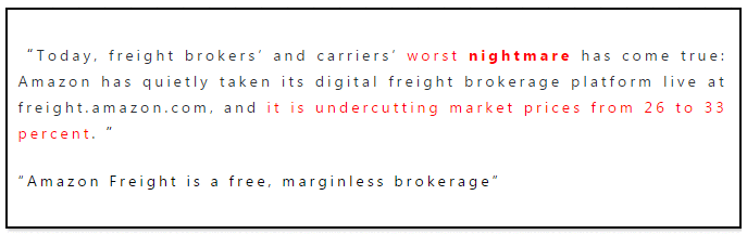 据搜航网获悉,亚马逊推出其全新数字化货运平台 freight.amazon.com。 美国媒体对于这个数字化货运代理平台的诞生,用了这段醒目的描述: “今天,货运代理和运营商最糟糕的噩梦已经成真: 亚马逊全新数字化货运平台Freight.amazon.com已悄然上线,它将市场运价骤降26%至33%!” 是的,你完全没有看错: 噩梦成真,运价比市场价低26%至33%,亚马逊这次推出的数字化货运平台目前完全是免费的, 非盈利的。 ▲亚马逊运费比市场低26%-33%,极具杀伤力 从分析数据可以看出,亚马逊给货主的报价甚至低于到港的合约价 (Delivery At Terminal-DAT contract rate)甚至特价(DAT spot rate)。换句话说,至少目前看来,亚马逊货运是一个免费,非盈利的数字服务平台! 上周,摩根士丹利股票分析师Brian Nowak曾指出:“亚马逊的物流服务在提高消费者对品质物流预期的同时,也增加了电子商务竞争的成本。从长远来看,我们也将此视为亚马逊发展其下一个颠覆性业务的“特洛伊木马”——第三方物流网络。” 亚马逊已经通过其配送和分拣中心运送了大量的货物,并且拥有广泛的卡车货运网络。对于许多行业观察家来说,亚马逊利用隐性网络效应 — 与亚马逊开展业务的托运人和运营商的总数 — 并将其业务双方联系起来,只是时间问题。 这项业务的一部分,可能是为了对冲货运价格的波动:通过建立大型货运经纪业务,AMZN将部分成本转化为收入。因此我们不难理解为什么亚马逊能快速成为成为亚洲海运货物进入北美洲的十大国际货运代理商之一。 对于此次亚马逊数字化代理平台的推出,业界反应激烈,特别是主要竞争对手,据Seeking Alpha的数据,主要竞争对手的股价已经受到冲击,其中包括C.H.Robinson、Xpo Logistics、J.B.Hunt Transport Services等。 亚马逊进入货运经纪业务的“去中介化”阶段,其中一个原因是因为亚马逊自身面临着重新加速其收入增长的压力,其收入已经从三年前的30%年增长率降到今年预计的15%以下。亚马逊不能允许卡车货运产能限制其增长,并且正在进入货运经纪公司以锁定该产能。 但这是“Georgia overdrive”的数字货运经纪启动模式:大量资本部署用于以微薄或负利润率快速扩展网络并获得股份。目前还不清楚亚马逊希望这项业务增长多大,但在一定程度上,随着亚马逊将经纪服务货币化,为进一步的创新提供资金,价格将逐渐攀升。 在2019年第一季度,亚马逊在运输上花费了73亿美元,并将其与分拣和配送中心一起归集为行项目“运输成本”。大约按年度计算,AMZN的“运输成本”为每年876亿美元,但这些并未在其损益表上正式列出。亚马逊可以将其经纪业务发展成100亿美元的运营——按成本销售产能,再加上“运输成本”,投资者可能需要数年时间才能开始询问利润率。 亚马逊这次通过全新数字化平台进军货运代理业务,虽然短期内不太可能让诸如C.H.Robinson Worldwide或Xpo Logistics等竞争对手感到恐慌。但是,它已经让这些公司,以及成千上万的小型货运代理企业意识到:一个新的物流时代已经到来。 |